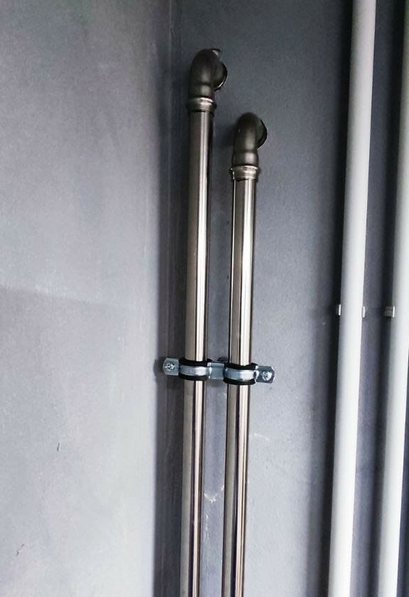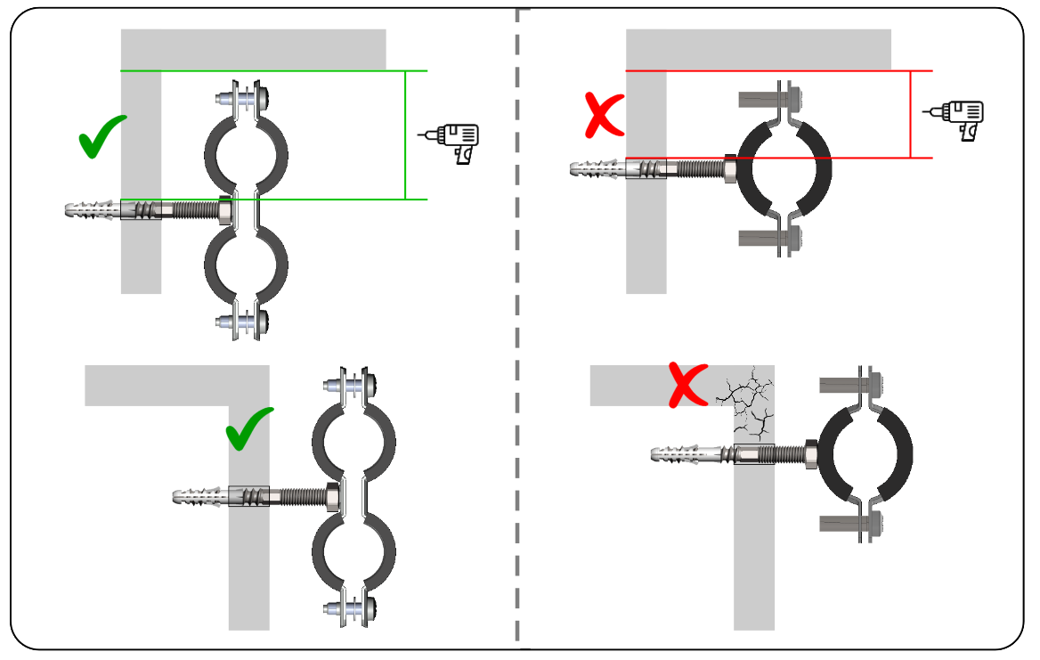увеличенное расстояние крепления шпильки от края хомута позволяет прокладывать парный трубопровод вплотную к внутренним и наружным углам поверхностей (так как дрель или перфоратор из-за своих габаритов не позволяет сделать перпендикулярное отверстие ближе 3,5-5 см от внутреннего угла, а близкое расстояние отверстия от наружного угла может привести к образованию трещины или откалыванию), что помогает задействовать неиспользуемое пространство и освободить больше места для монтажа других элементов